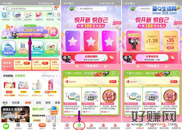 淘宝APP首页-天猫超市-中间横幅【疯抢200元神券】-底部【全部会场】-点击抢福利