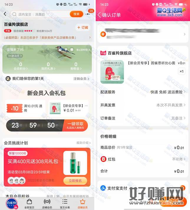 淘宝搜索【百雀羚旗舰店】-底部【店铺会员】-看见0.01元入会领面膜才入会