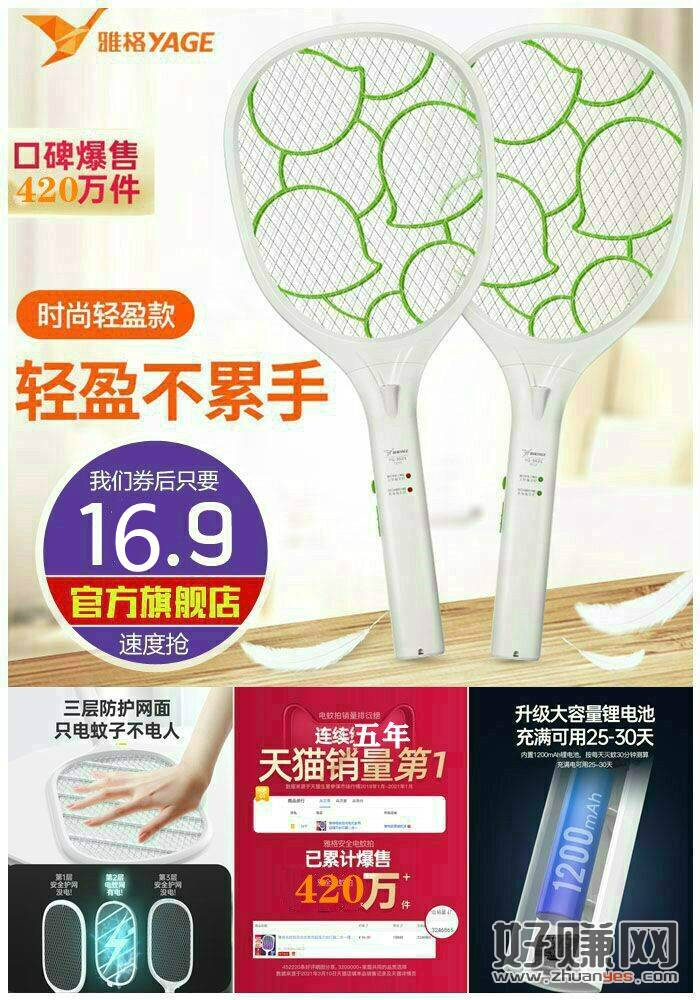 雅格家用电蚊拍16.9元高配版,充电款!满电能用一整