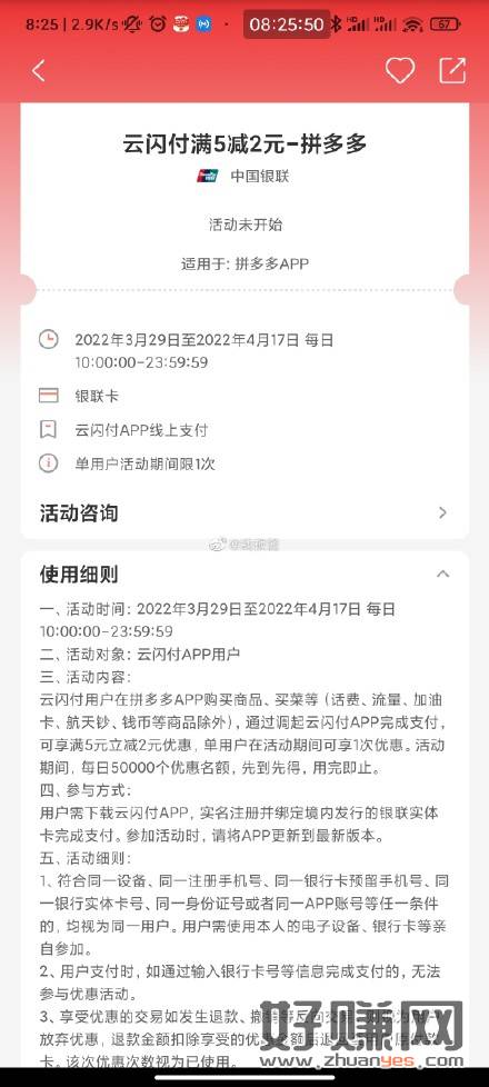 3.29-4.17,每日10点起,拼多多用云闪付或者Apple Pay有5-2,活动期间一次机会