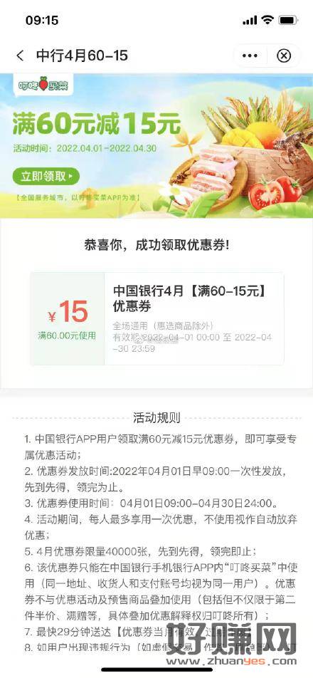 中行APP-生活-叮咚买菜,可领60-15券,近期买菜留意