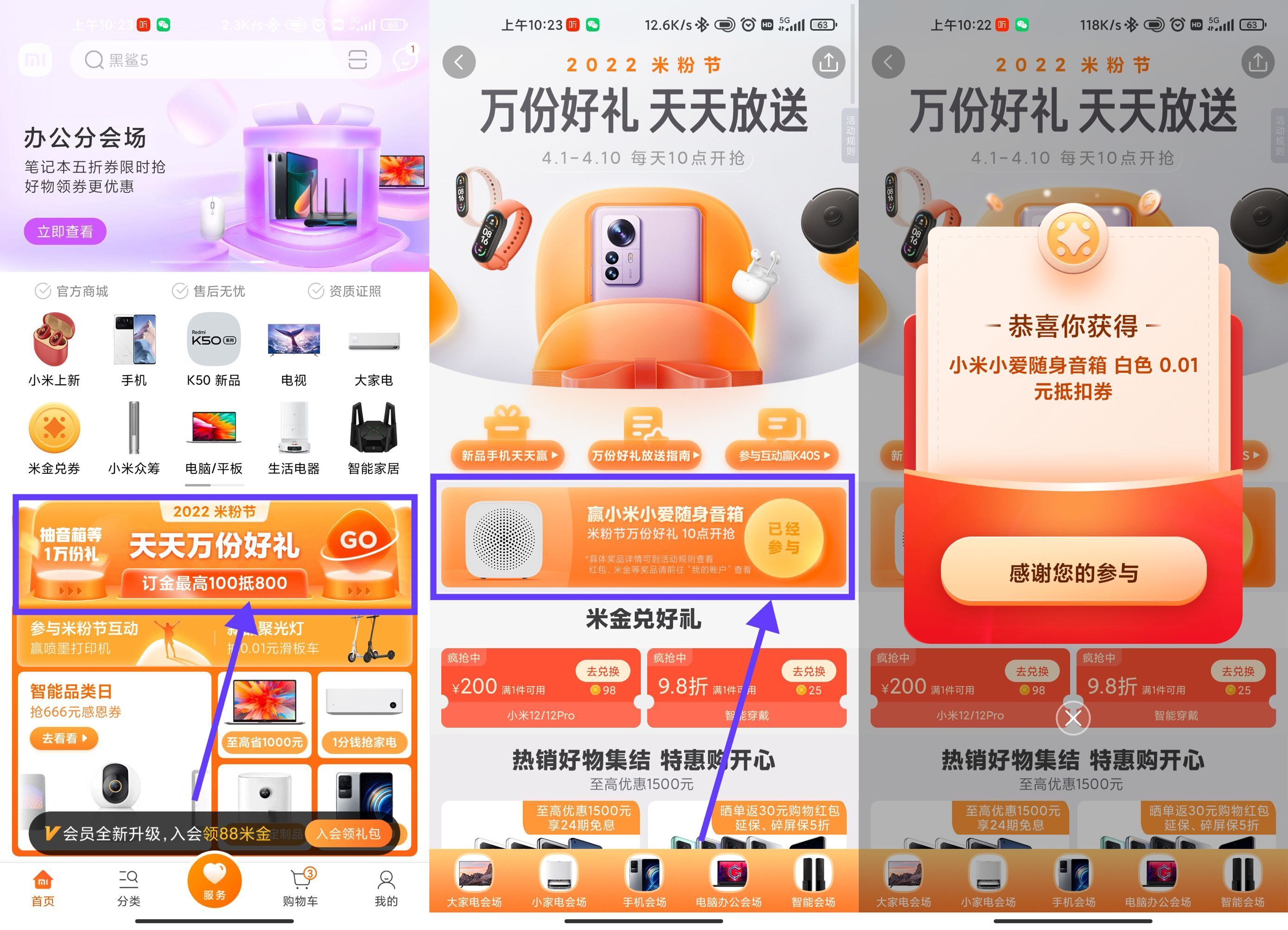 【小米商城抽小爱随身音响】应用商店下载“小米商城”APP->登陆账号->首页“天天万份好礼”->立即抽奖->每天一次机会->每天奖品不同->不中多换号试试->中奖就是0.01元购买下单