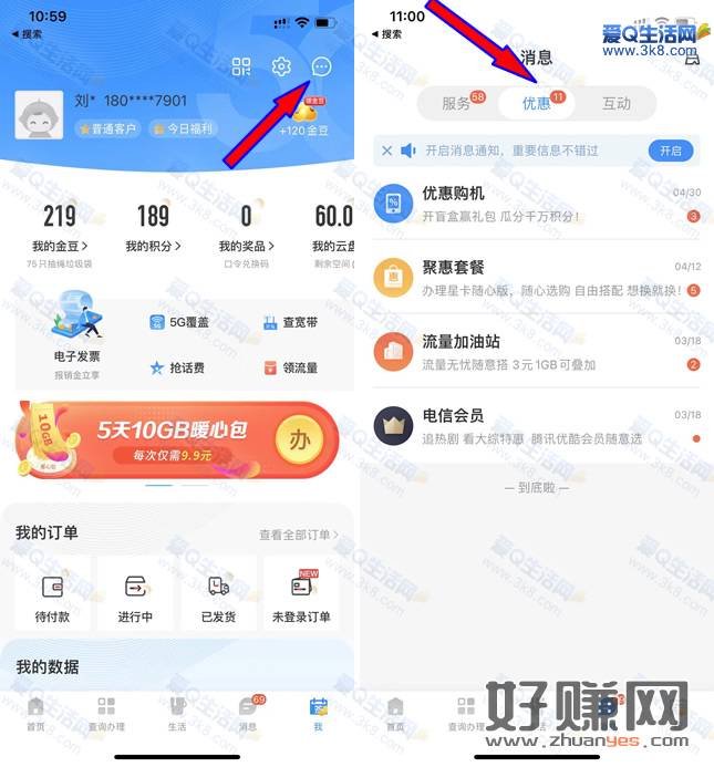电信营业厅APP-我的-右上角消息进入-优惠-优惠购机