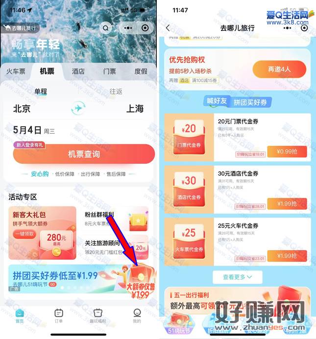 去哪儿1.99元购26-25元火车票代金券 需要2人助力