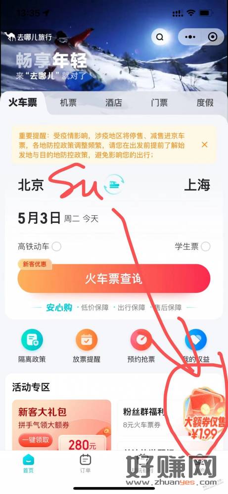 微信搜索去哪儿小程序-进入小程序右下角有个大额券仅售1.99元进入-下拉可看到1.99元抢25元火车票代金券,需要邀请2名新用户助力才行