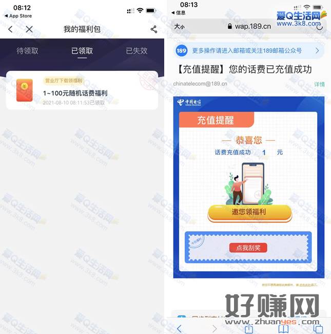 亲测1元话费秒到!中国电信抽1-100元话费