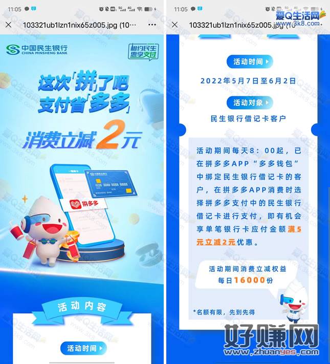 每天都可享5-2元的优惠,需要拼多多APP多多钱包绑定了民生银行借记卡