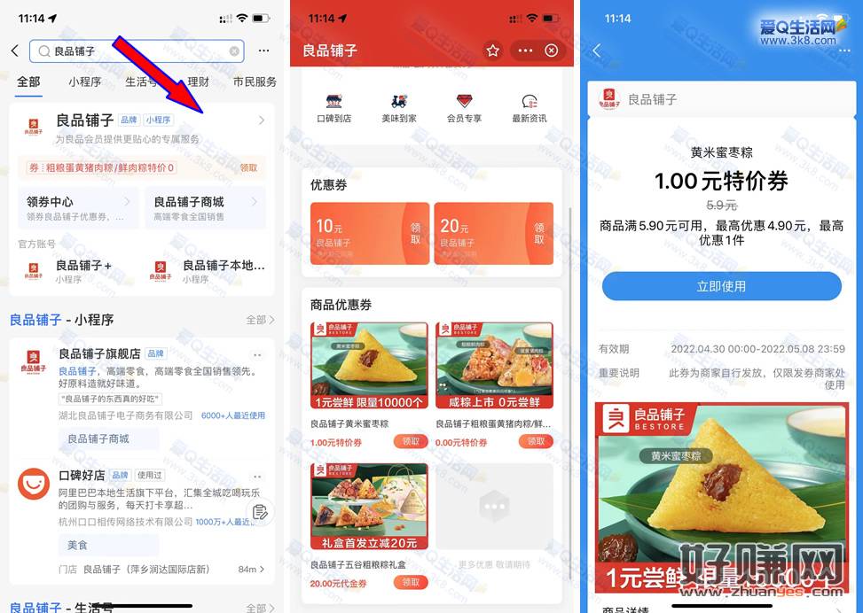 支付宝APP搜索【良品铺子】进入下拉找到1元粽子,可直接领取,领取成功后可在支付宝卡包中查看,点击立即使用可直接去店面核销