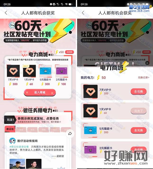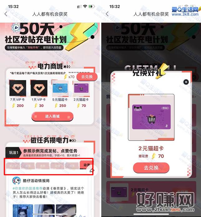 电力就可以兑换猫超卡/优酷会员,每日总共可获得79个电力,70电力就能兑换猫超卡