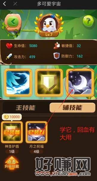 游戏攻略:第一章:游戏进去,boss前面的关卡随意过玩玩游戏就行。到了boss你会发现打不过,这个时候就要用到技能了。ps:技能在游戏首页,点那只鸡,下面点技能,10000金币 可以买一个技能 通关第一关boss需要1级攻击技能和2级治疗技能 也就是3w金币(两天左右。)