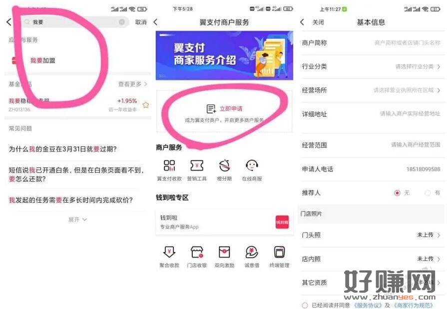 首页搜我要加盟,进去点立即申请,进去填资料,图片乱提交都行,提交后直接下一步下载钱到啦APP,点任务添加好友即可完成任务,扫自己银联码套出来