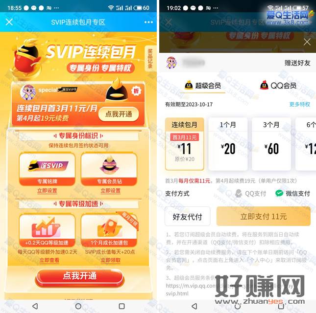 点进活动页面就能看到开通连续包月能领1个月成长加速包,点击去开通就是需要支付11元