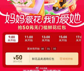 美团外卖,鲜花频道9点开始有50鲜花券