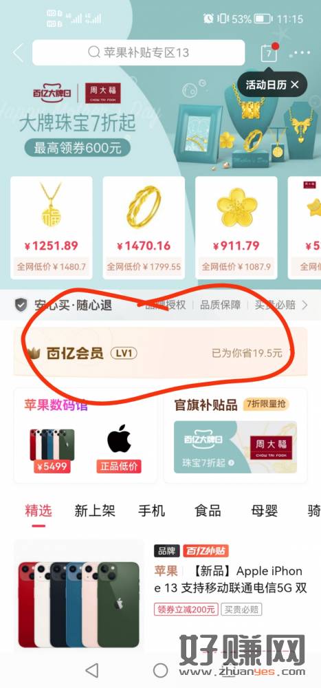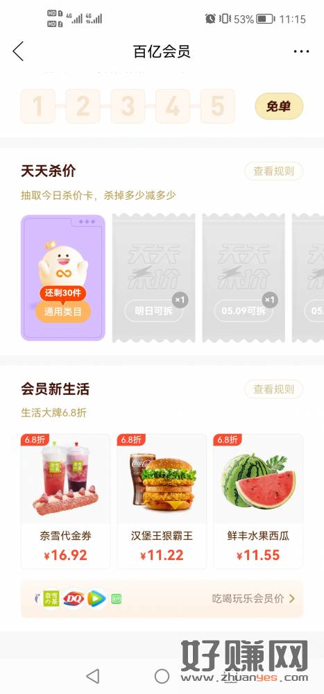 拼多多app~搜百亿补贴~加入百亿会员(黑号看不到的请忽略)~会员权益~生活大牌6.8折~奈雪(每周一次)~买30券~折后实付16.9,飞凡20收