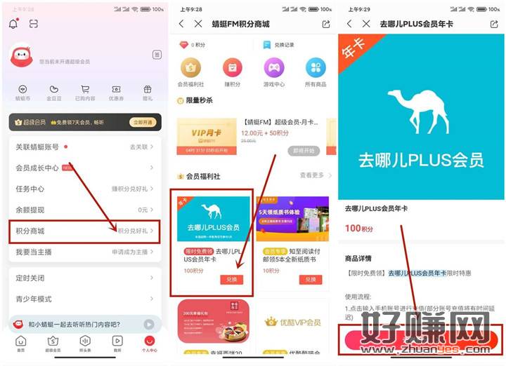 打开“蜻蜓FM”APP 登录后点击【个人中心-积分商城】进去 然后点击兑换【去哪儿年卡】进去