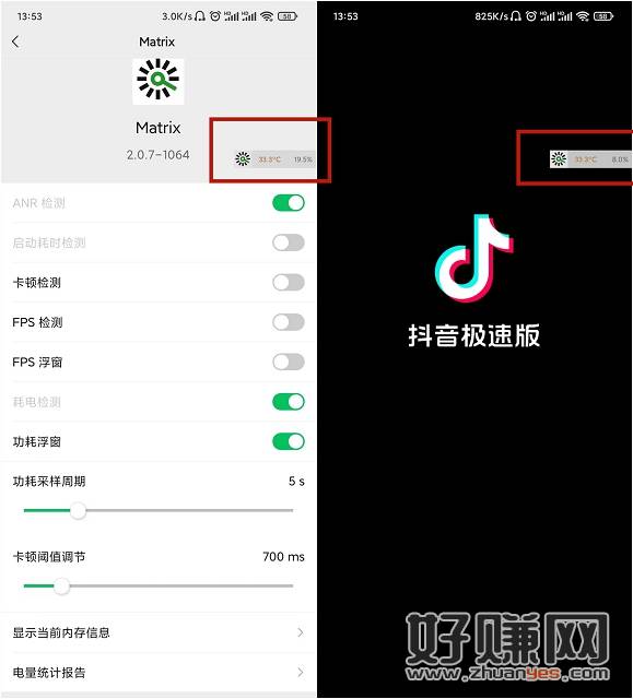 将【功耗浮窗】选项勾选上,此时界面就会出现浮窗,显示手机实时温度及各项参数。