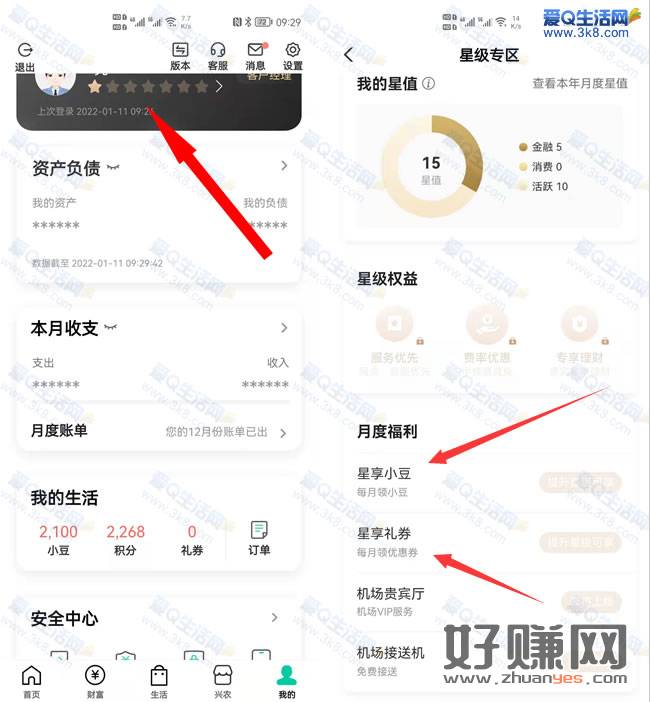 1.农行APP-我的-顶部【星级】点进去-月度福利-【星享小豆】、【星享礼券】-符合等级可以领取小豆、微信立减金