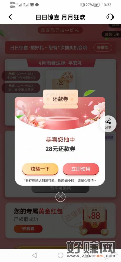 平安口袋app首页,月月狂欢,抽奖中了28元还款券