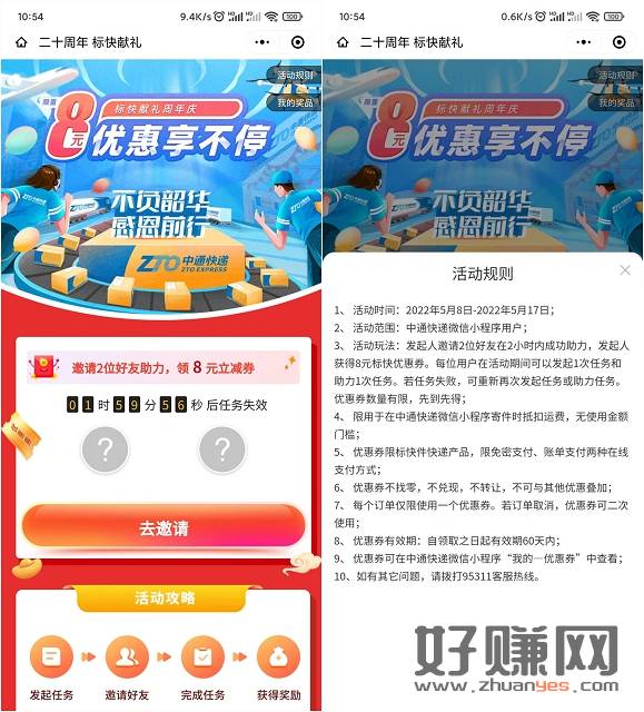 邀请2位好友助力免费领取中通快递8元无门槛寄件券