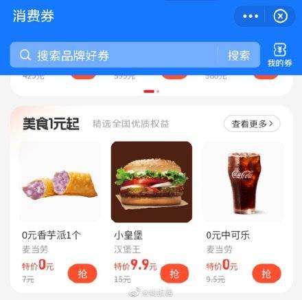 支付宝-消费券-美食1元起,麦当劳0元香芋派和可乐 任
