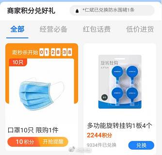 11点,支付宝APP-我的-商家服务,10积分兑换口罩
