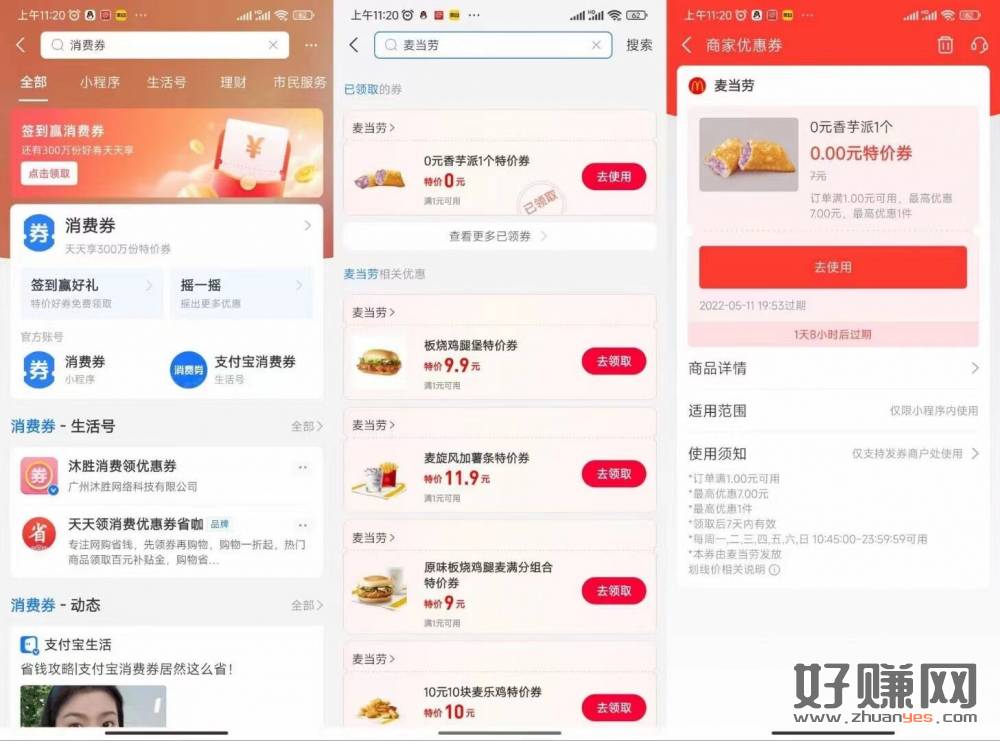 【免费领麦当劳香芋派】打开支付宝搜索“消费券”->然后再搜索“麦当劳”->如图直接领取->需到店任意消
