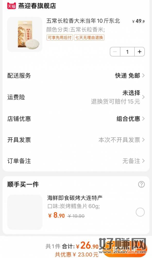 五常米,26.9元十斤无视页面价格,下单立减3元