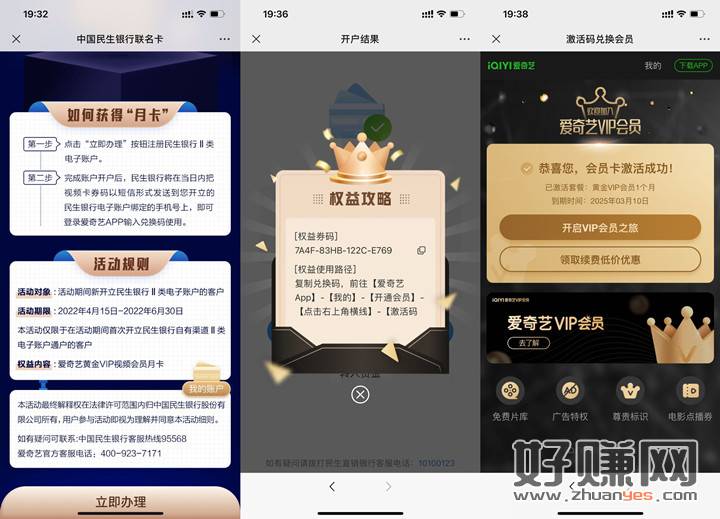 民生银行开电子账户免费领取爱奇艺会员月卡 手机打开活动地址进入活动,填写信息绑卡开通民生银行电子账户,即可免费领取爱奇艺会员月卡!