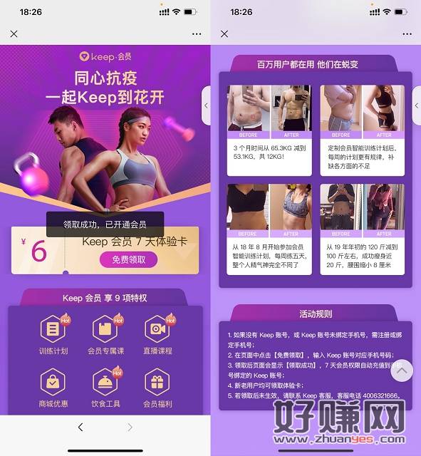 手机打开链接进入活动,登陆账号即可免费领取7天keep会员周卡,疫情在家也记得多多锻炼哦!