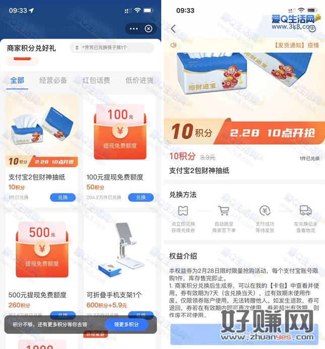 支付宝APP搜索【商家服务】-商家积分点进去-积分兑换好礼-10积分兑换2包抽纸