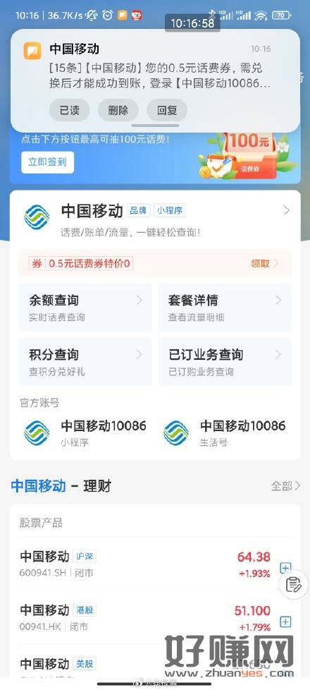 支付宝搜,中国移动,领移动0.5话费,兑换秒到