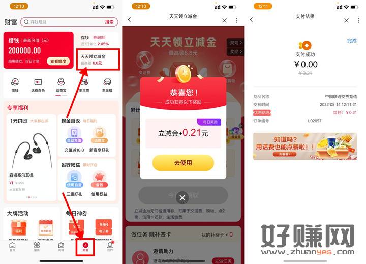 打开联通APP 点击首页的【天天领立减金】进入活动,点击签到领取随机立减金