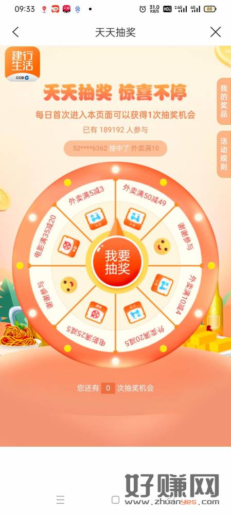 建行生活——520甜蜜开启活动进去抽奖,水了一张50—49的外卖券。