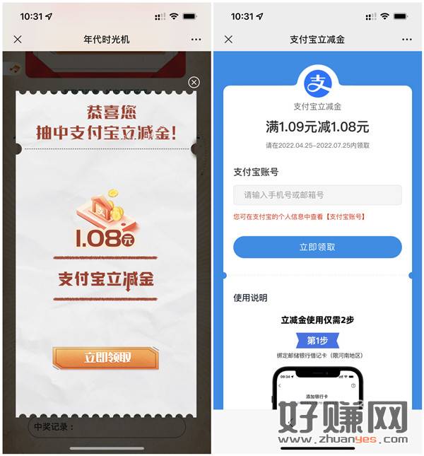 河南邮储银行抽支付宝1.08元立减金 可无损提现 活动虽然是可以全国各地的用户去参与的,但是抽到了立减金后绑定到支付宝里面去付款的时候提示必须要河南的邮政卡支付才可以抵扣,所以不是河南邮储的用户就不要上了!
