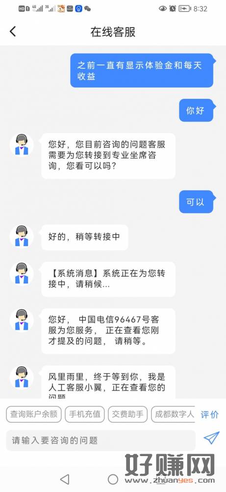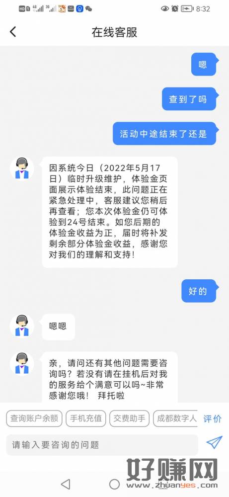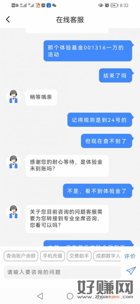翼支付送的1万的001316的体验金收益,翼支付今天每个给了33块多到余额,看今天还是涨的0.18%,一万收益18块,后面有望正收益维持到24号。问了客服今天是因系统维护给了前部分收益到余额,后面到24号有正收益还是会给。