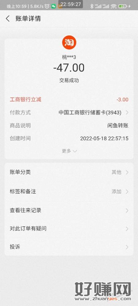 刚刚闲鱼给小号转账50元工行卡减了3块,支付页面有显示