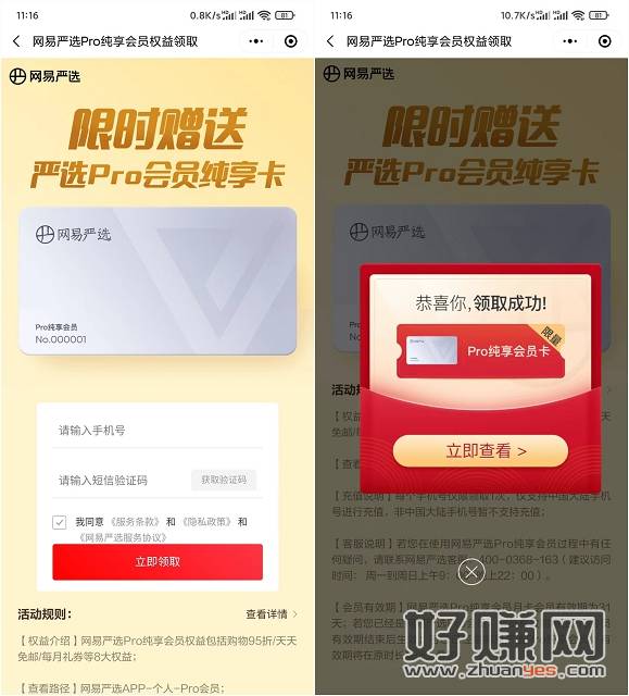 微信扫码进入活动 输入手机号验证码即可免费领取严选Pro会员纯享卡一个月!数量有限先到先得!