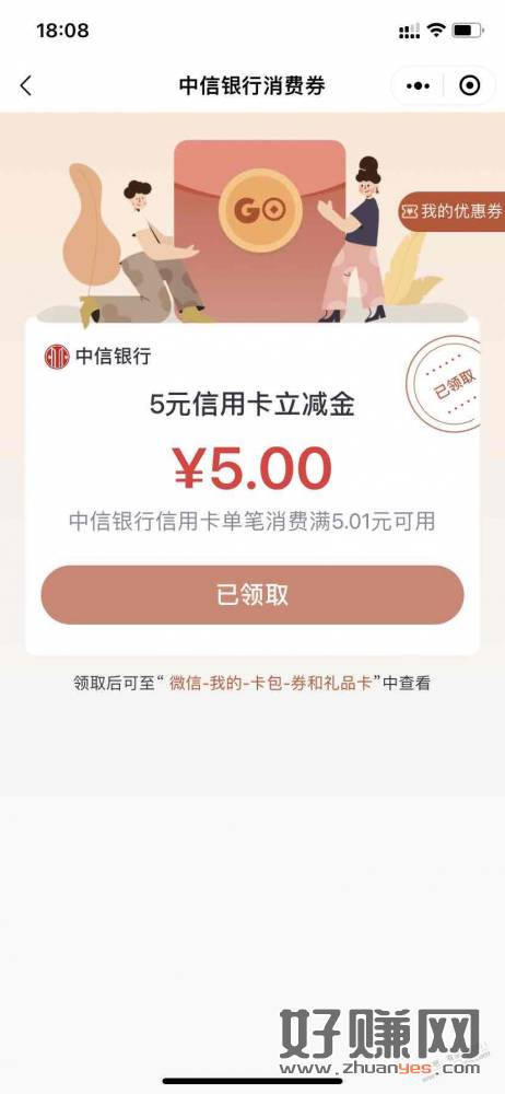 【中信银行】您的5元xing/用卡立减金已发放,请及时领取!先到先得!路径:中信银行微信小程序首页-消费券。(本月限领1次,如已领取,请忽略)回TD退订