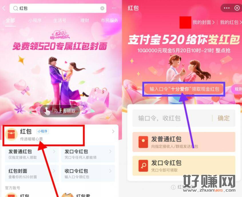 【支付宝520活动整点领囗令红包】支付宝APP->搜索“红包”进入->页面上有囗令提示->今天10~21点整,每个整点去输入囗令领随机红包,共12场!