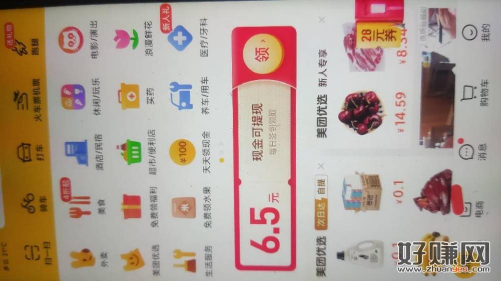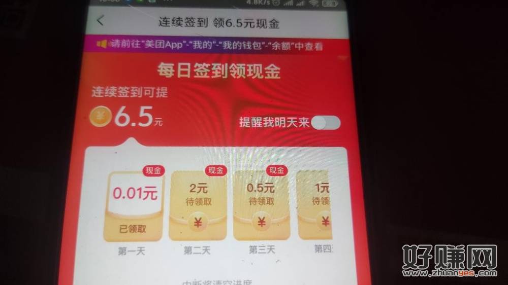 美团很久未登陆的账户 签到7天 6.5元现金提现银行卡 好用加果