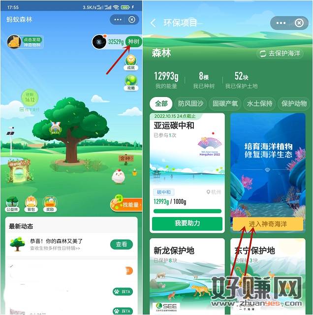 点击支付宝的【蚂蚁森林】进去,点击种树,如果有资格的话就可以进去,如果没有的话就只能通过好友邀请进入了。