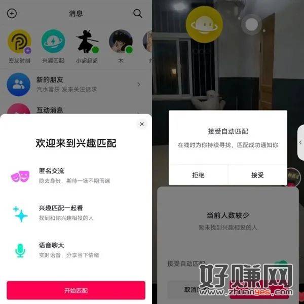 “匿名聊天”来了,不加好友也能发消息 近日,抖音App在其“消息”页内的上方窗口中,新增“兴趣匹配”功能,该功能主打基于短视频内容的兴趣社交,拥有“匿名聊天”“兴趣匹配一起看”和“语音聊天”等特点