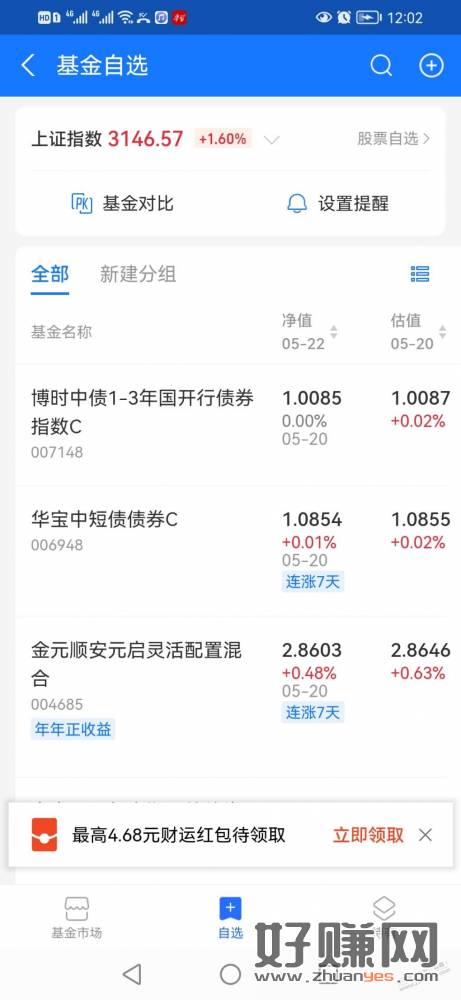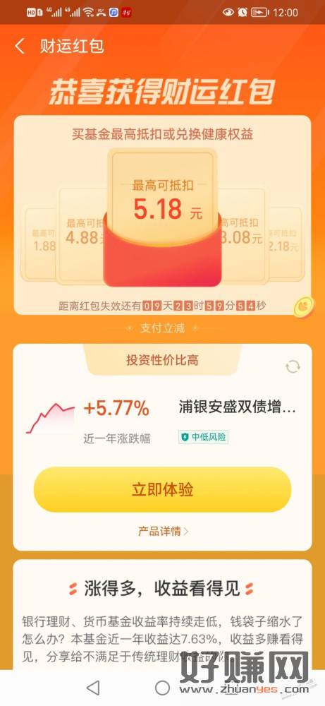 老规矩,支付宝 空仓的扫,有5.18,投吧基070009又弹一个约4元的,基金自选也有一个