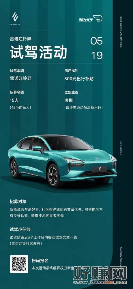 1.试驾雷诺江铃“羿”(一款纯电轿车),试驾后提交一篇文章,有300元补贴,坐标深圳,5月27日报名截止,15个名额现有12个人报名,不确定是报满即止,还是从中择优选取入选试驾人员。活动要求具体细节请扫海报二维码了解(新出行官方二维码,不带我个人邀请)。