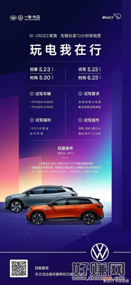 2.试驾一汽大众id4/id6,有1000元补贴,坐标深圳/杭州,各15个名额,5月30日报名截止,不确定是报满即止,还是从中择优选取入选试驾人员。活动要求具体细节请扫海报二维码了解(新出行官方二维码,不带我个人邀请)。