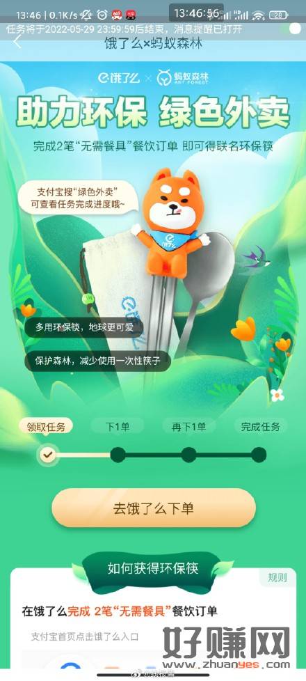 支付宝搜,绿色外卖,完成两笔无需餐具餐饮订单,可得定制餐具一套,去年好像也有类似活动