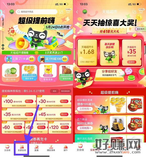 打开手机淘宝APP扫码进入活动 点击底部【全部会场】进去 点击抢618元大礼抽随机天猫超市卡