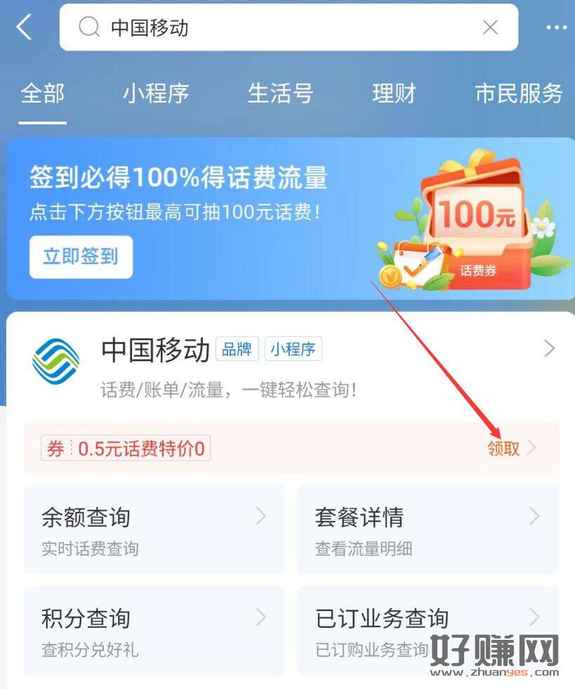 打开支付宝APP,搜索中国移动 充50得55话费 需要在中国移动APP充值