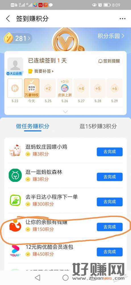 签到,积分,做任务赚积分,有一项 让你的余额有钱赚,点进去 余额自动转余额宝开通有150积分,开通了的关闭再进去就有了。