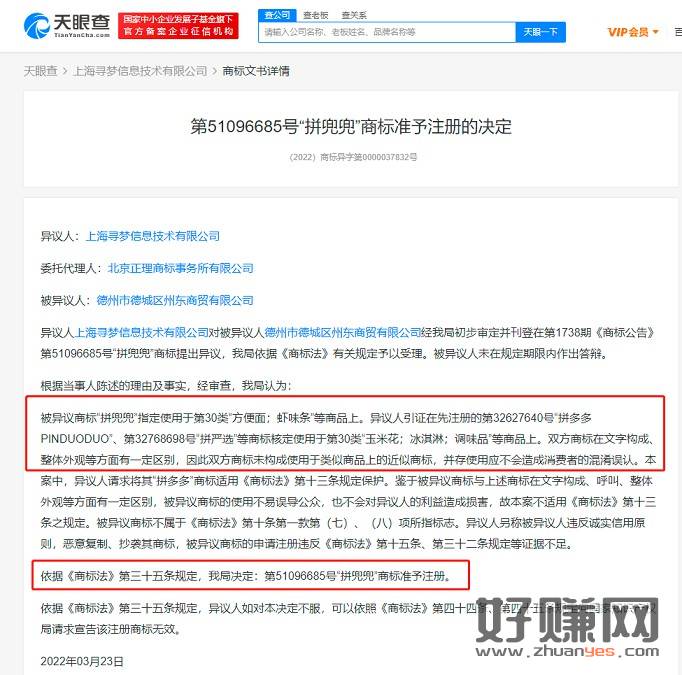 文书显示,上海寻梦信息技术有限公司对德州市一商贸公司申请的“拼兜兜”商标提出异议